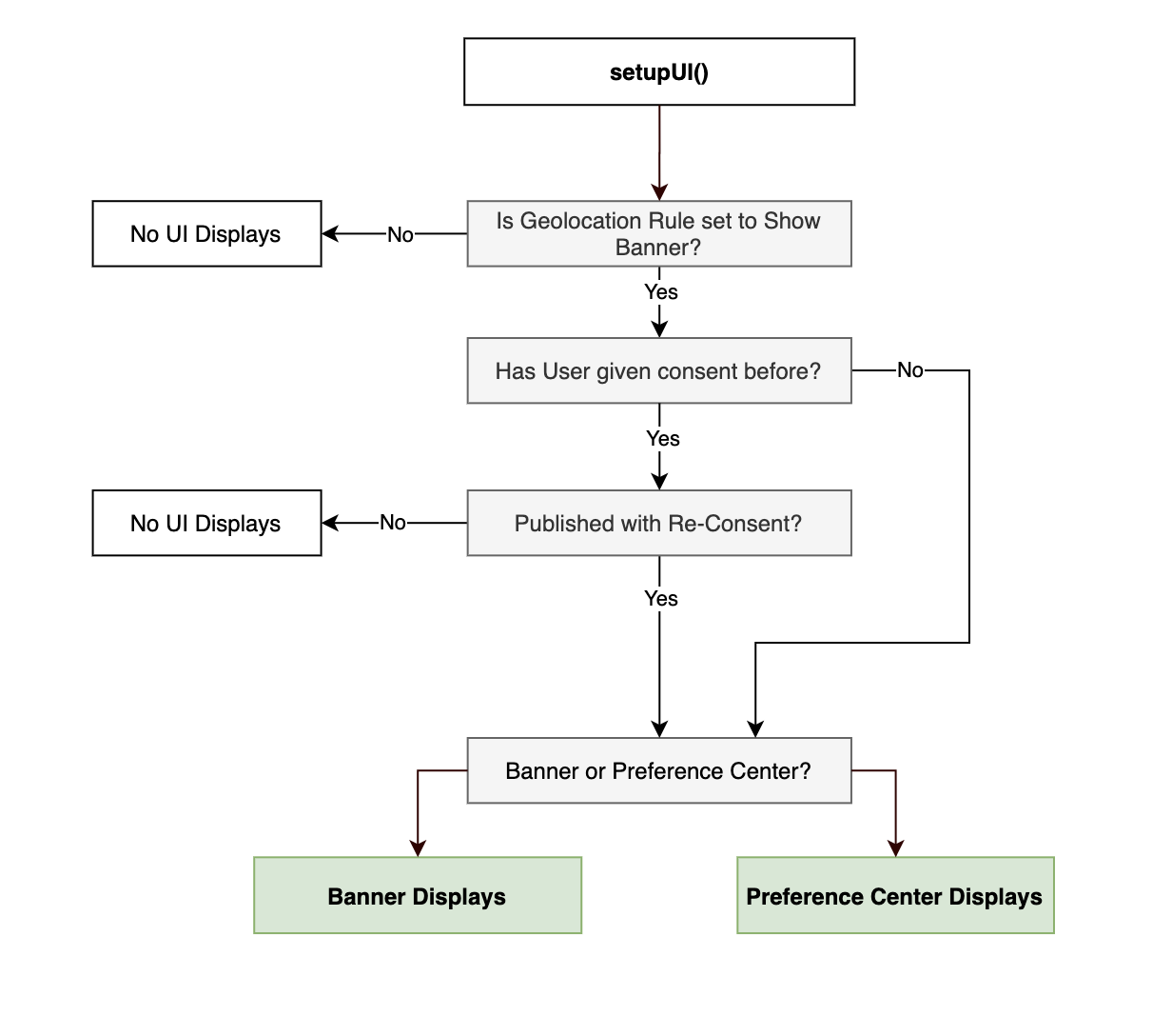 setupUIThis method can be used to render a UI for Banner or Preference Center. setupUI()automatically evaluates the shouldShowBanner() logic to determine whether or not a banner should be shown to users. See below for more info on how shouldShowBanner gets calculated. See below for more info on how shouldShowBanner() gets calculated.